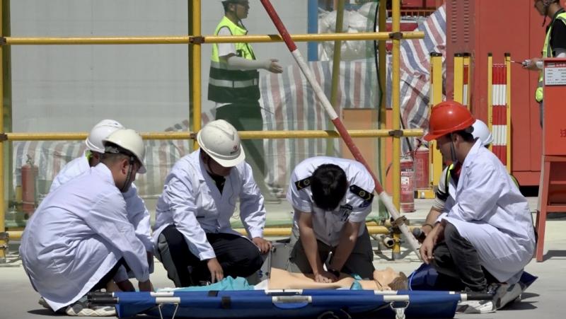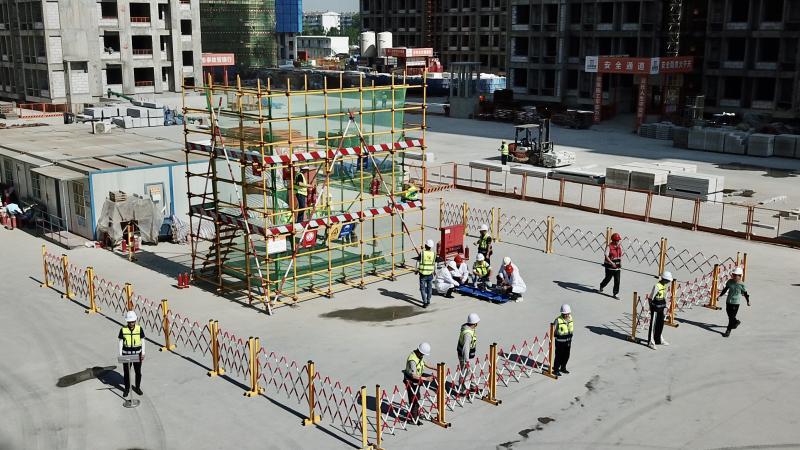 隨后,柳林路項目部開展火災,高處墜落應急救援演練,本次演練模擬了施工區域突發火情,慌亂中導致工人雷某腳下失穩,從無防護缺口墜落。事故發生后,率先發現險情的工作人員立即示警并上報,現場立刻啟動應急預案,在出動各應急小組實施救援的同時,緊急聯絡消防、公安、醫療單位,迅速、有序合力完成險情處置。